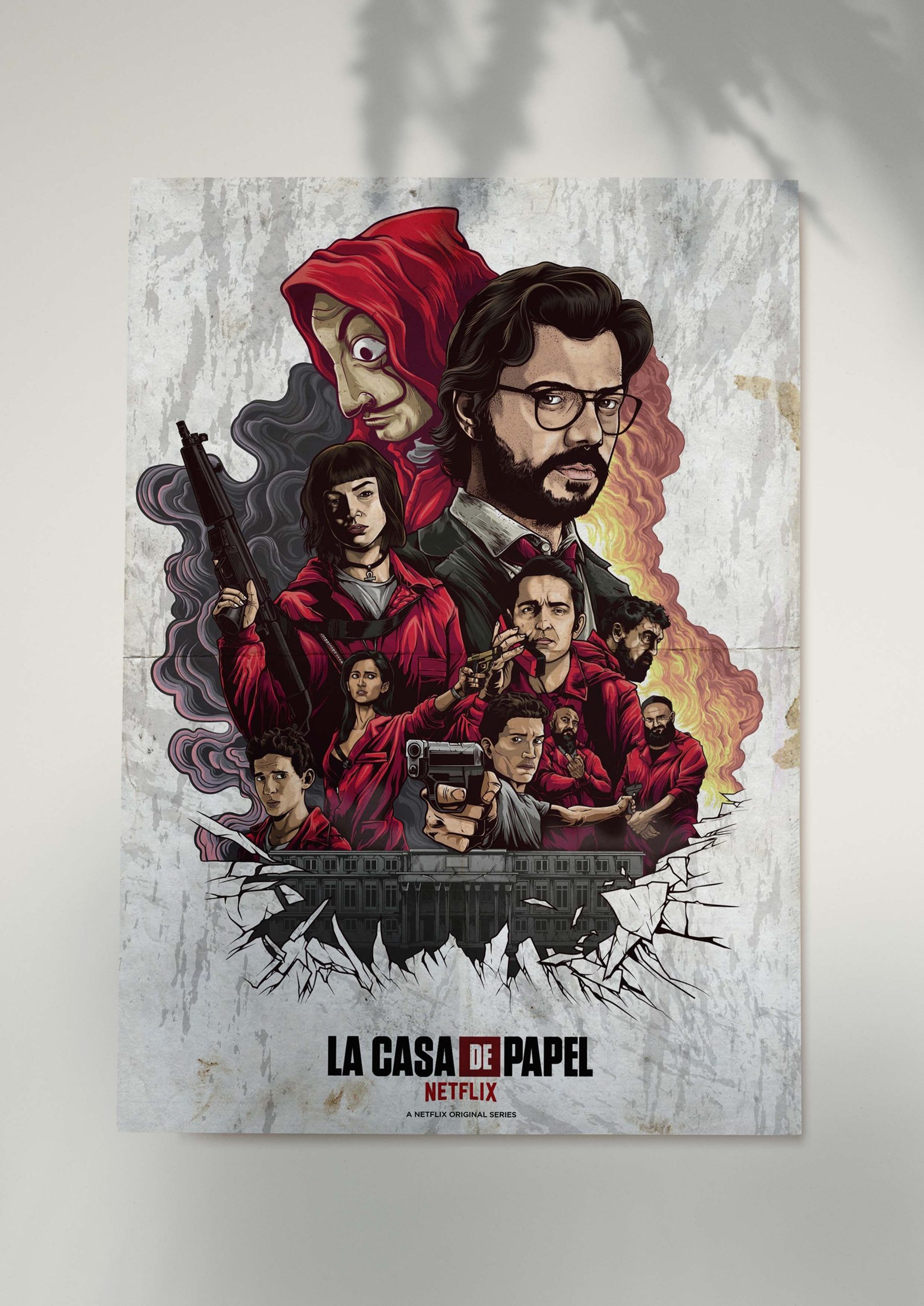 Immerse yourself in the revolution with this La Casa De Papel (Money Heist) poster, featuring the core gang led by The Professor, Tokyo, Berlin, and the rest of the red-jumpsuit resistance. With bold comic-style illustration and gritty background textures, this artwork captures the energy, danger, and strategy of one of Netflix’s most iconic series.