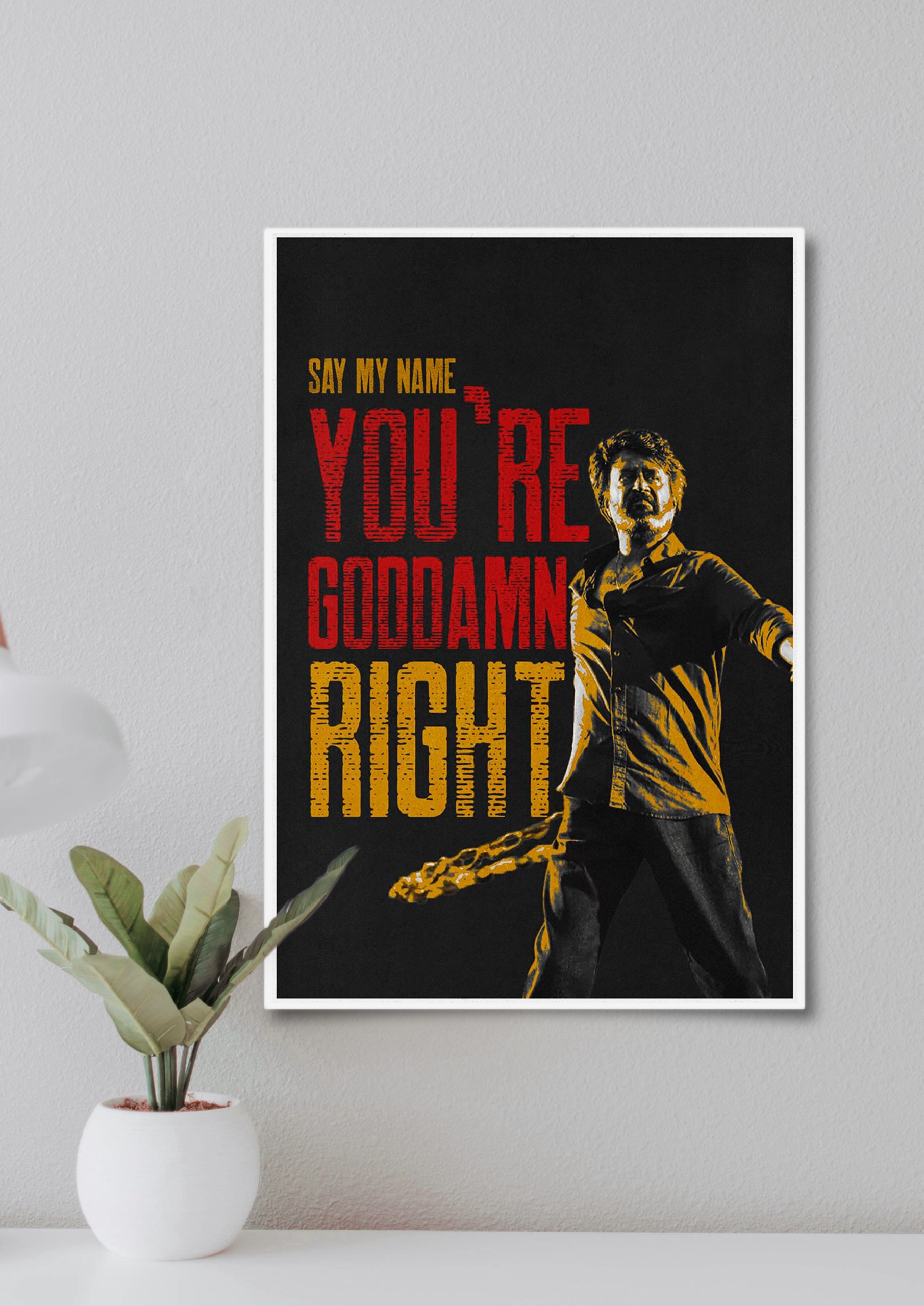 Commanding presence meets unapologetic style in this striking “Say My Name – You’re Goddamn Right” coolie poster. Featuring a powerful character stance, illuminated in deep gold and fiery red tones, this artwork radiates dominance, confidence, and authority.
